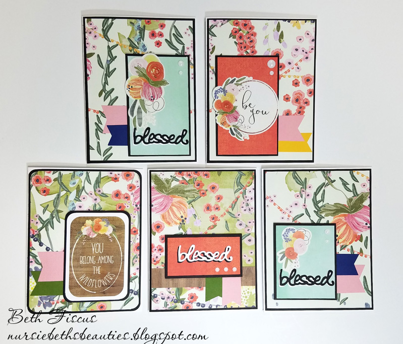 First up, this set of 5 floral background cards. I used some stickers as well as a blessed die cut from Momenta. I embellished with white enamel dots.